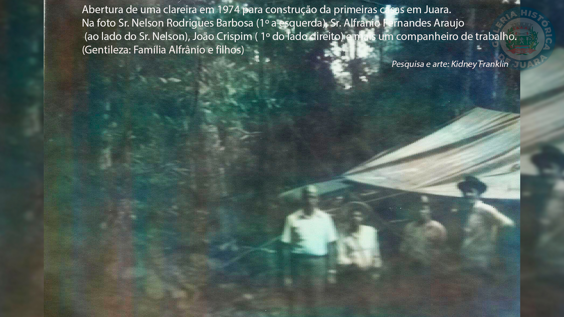 Abertura de uma clareira em 1974 para construção das primeiras casas em Juara. Na foto Sr. Nelson Rodrigues (1° a esquerda) Sr. Alfrânio Fernandes Araújo (ao lado do Sr. Nelson), joão Crispim (1° do lado direito) e mais um companheiro de trabalho. Gentileza: Família Alfrânio / Pesquisa e arte: Kidney Franklin.