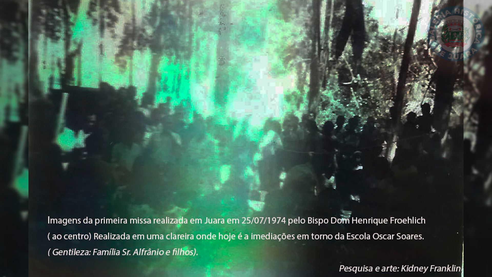 Imagens da primeira missa realizada em Juara em 25/07/1974 pelo Bispo Dom Henrique Froehlich em uma clareira nas imediações da Escola Oscar Soares. Gentileza: Família Sr. Alfrânio / Pesquisa e arte: Kidney Franklin