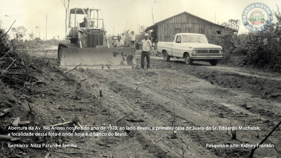 Abertura da Avenida Rio Arinos no fim do ano de 1973, ao lado direito a primeira casa de Juara do Sr. Eduardo Muchalak, a localidade dessa foto é onde hoje é o Banco do Brasil.
